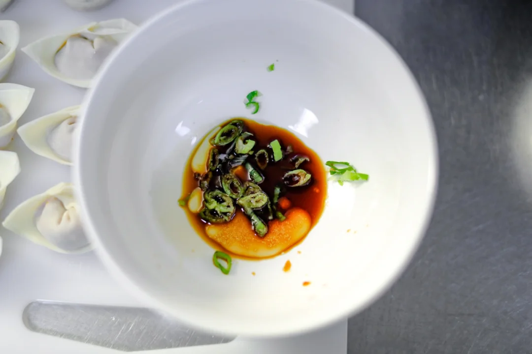 🌟5.将葱花,生抽,食盐,芝麻油放入碗中,用鸡汤或者馄炖汤冲开,把煮好的馄炖放进去。