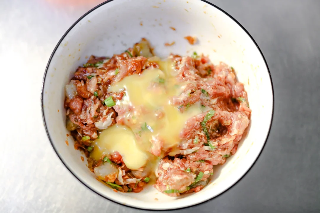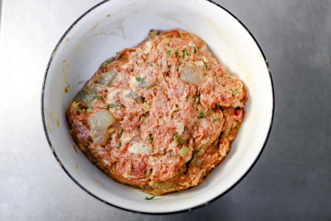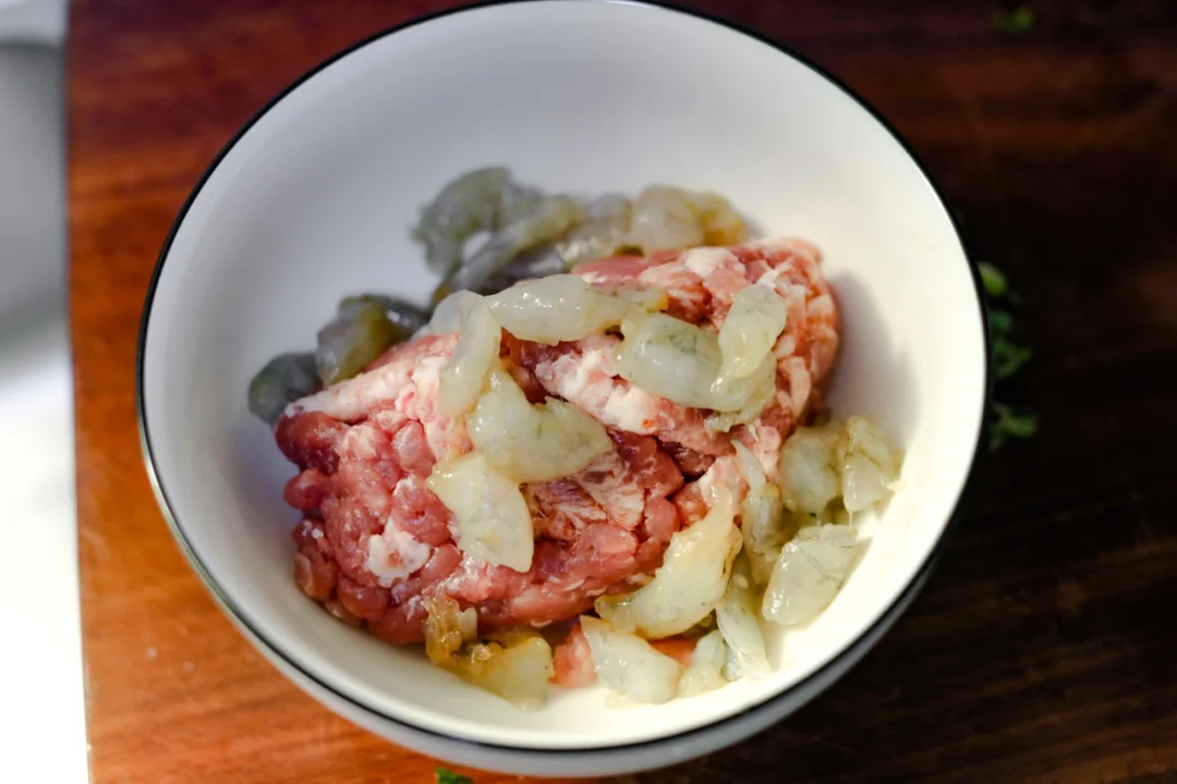 🌟2.准备一个空碗,加入猪绞肉和虾仁丁,放入葱花,姜末,食盐,白糖,白胡椒粉,鸡精粉,老抽,芝麻油,食用油混合搅拌均匀并且上劲。