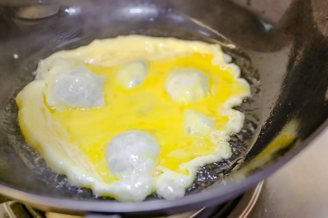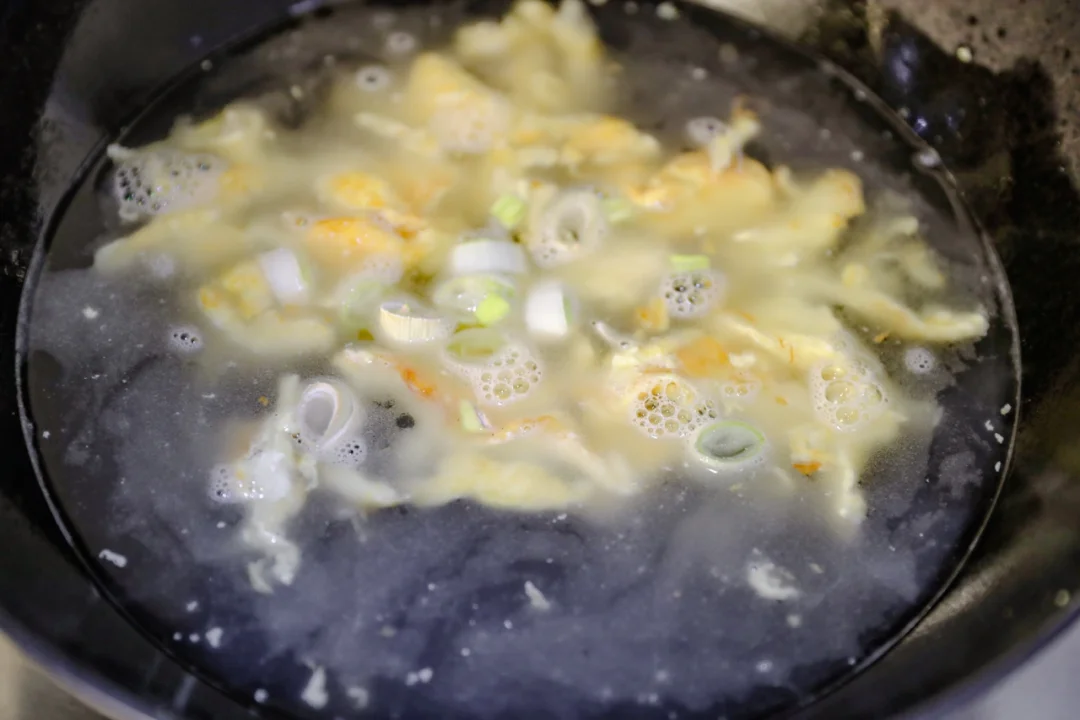 🌟1.鸡蛋打入碗中,搅散。炒锅放油,把鸡蛋放进去 ,炒散,加入开水。加入食盐,生抽,白胡椒粉,味精来调味。(也可以用煎鸡蛋来代替)