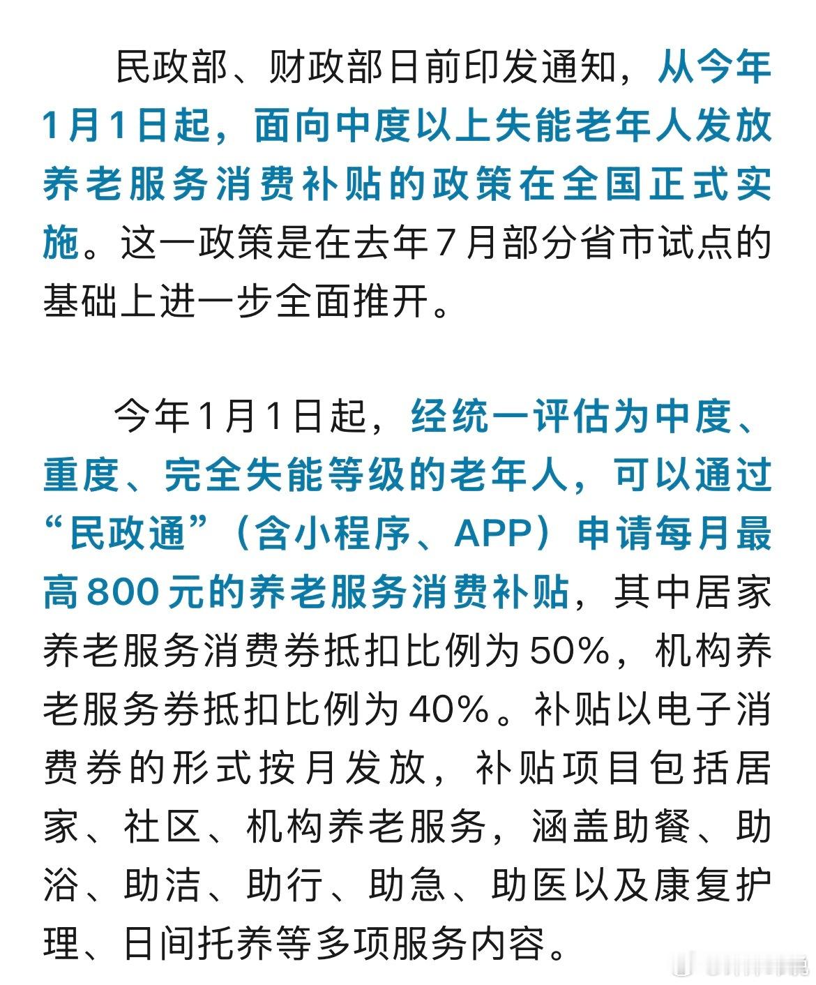 从今年1月1日起,我国面向中度以上失能老年人发放养老服务消费补贴的政策在全国正式
