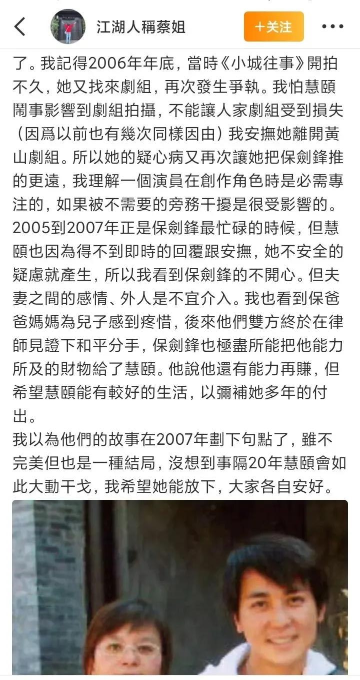 保剑锋经纪人发长文,写了三个否定,会反转吗?还说离婚时,保剑锋把所有财产都给了慧颐。 不管怎么说,黄慧颐与保剑锋都不般配,以前是夫妻,也是姐弟,现在外形相差更大。黄慧颐典型的广东女人长相,好瘦,眼睛深深下陷。 与现任妻子何珈好,倒是有几分般配。 黄慧颐比保剑锋大7岁,两人刚结婚时,黄慧颐33岁,称自己像小女孩。 如今却还为曾经的婚姻纠结,叫苦连天。 有时提到前夫,依然嘴角上扬。 1、保剑锋经纪人发文,透露保剑锋的红,与黄慧颐无关。 当初,她接到这部剧,还让编剧加了一段与黄慧颐的戏。 黄慧颐出演夏老师。 保剑锋红了,但是与黄慧颐无关。 2、男方红了以后,片约不断。 与其他明星一样,剧组为家。 而黄慧颐在家里闲着,想得也越来越多。 对丈夫不放心,总是想着保剑锋对她嘘寒问暖,如果确实是这样。 符合黄慧颐广东小女人的性格。 更离谱的是,保剑锋拍摄《小城往事》的时候,黄慧颐赴安徽哭闹。 3、经纪人说,这已经不是黄慧颐第一次去剧组闹了,只要觉得保剑锋冷落她,便到剧组哭闹。 编剧王海林还透露,保剑锋前任带暗器去剧组伤害他。 真假有待定论,但是唯一可以可能的是,黄慧颐太爱小丈夫。 比男方大7岁,自己还不努力,娱乐圈诱惑那么多,只能被抛弃。 另外,女人越是闲下来,想法越多,老是揪着自己的男人。