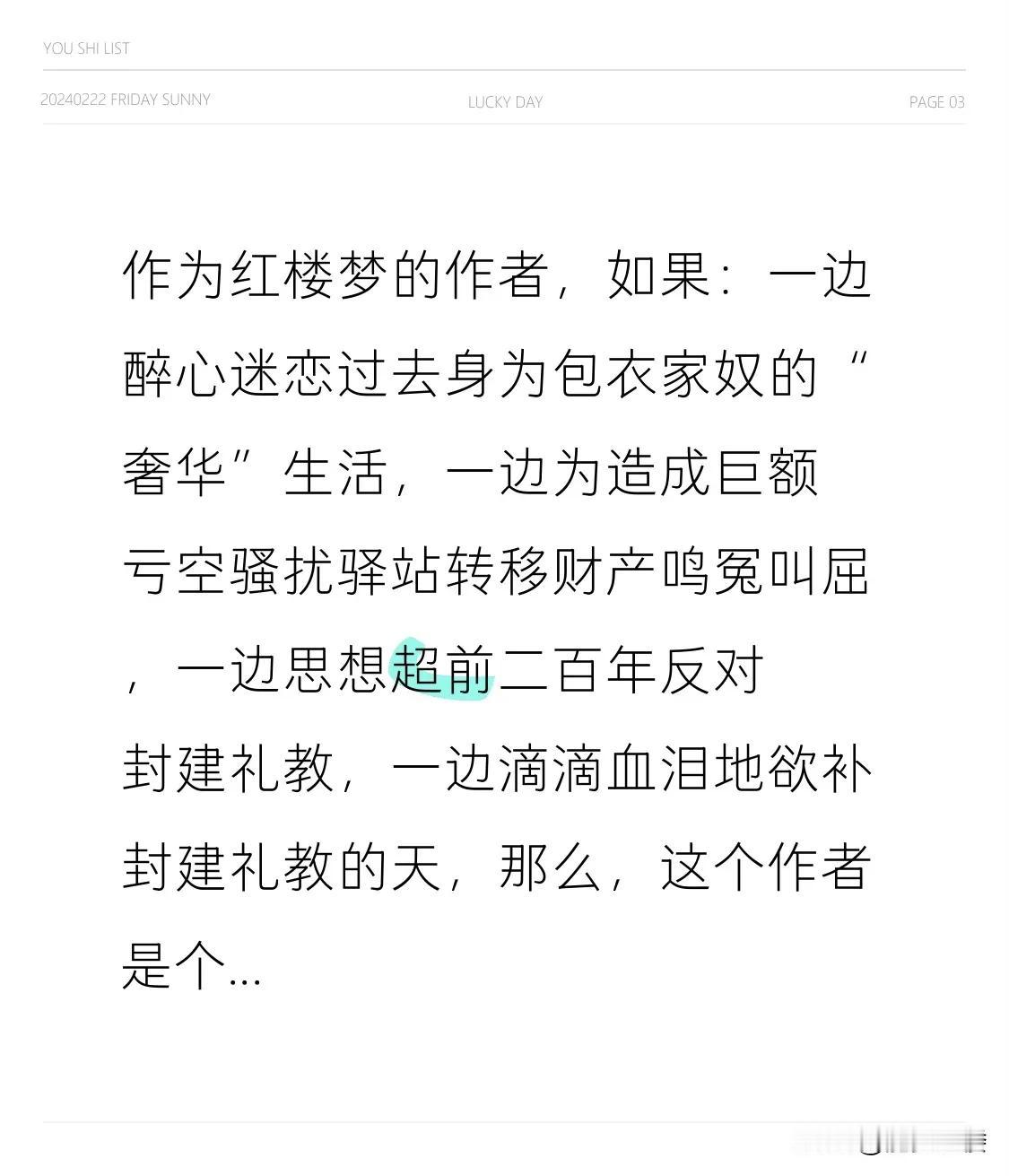 作为红楼梦的作者,如果: 一边醉心迷恋过去身为包衣家奴的“奢华”生活, 一边为造成巨额亏空骚扰驿站转移财产鸣冤叫屈, 一边思想超前二百年反对封建礼教, 一边滴滴血泪地欲补封建礼教的天, 那么,这个作者是个什么样的人呢?