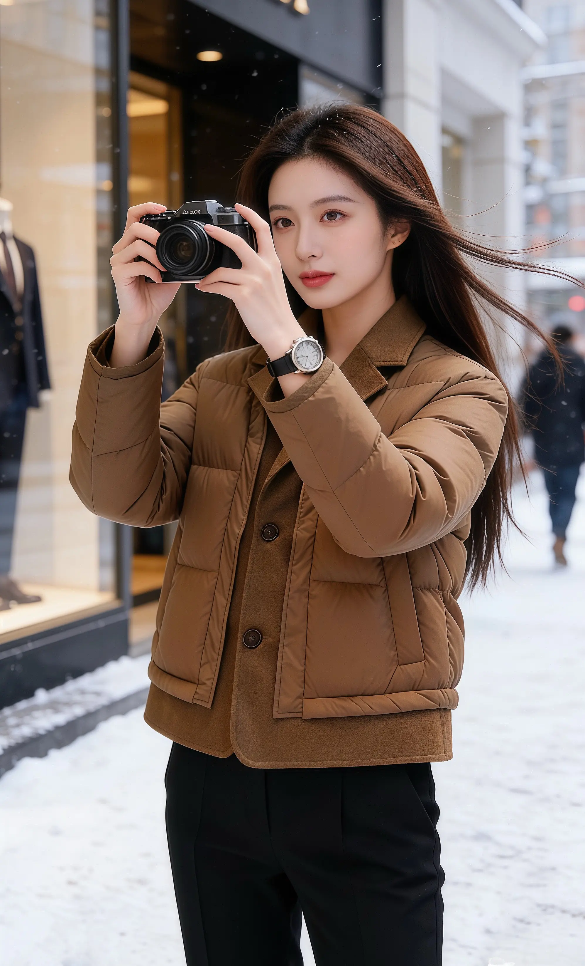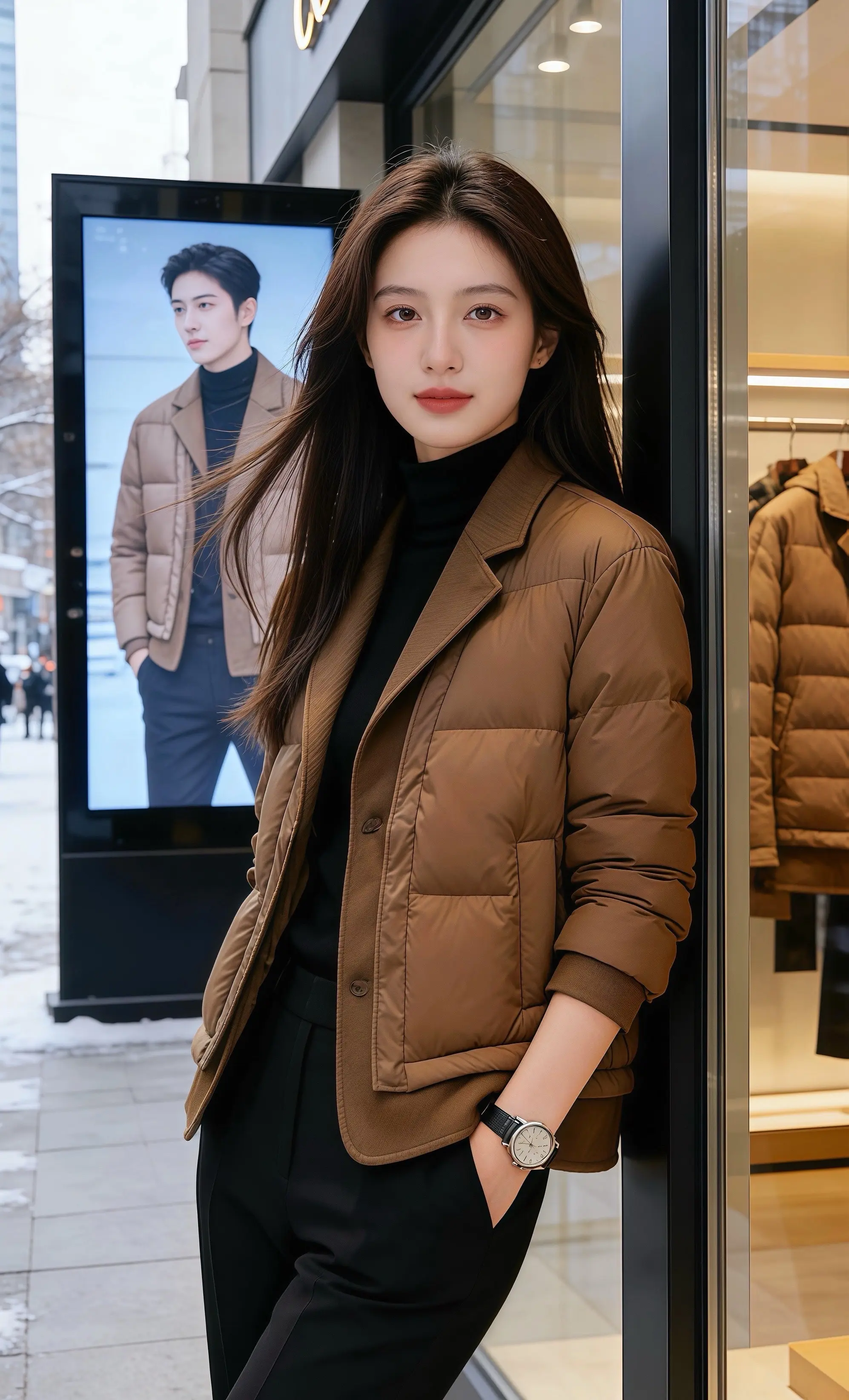 雪粒落在许妍的发梢,她裹着焦糖色棉服走过橱窗,像把整个暖冬穿在了身上。利落的西装领中和了蓬松感,内搭的黑色高领衬得脖颈线条愈发柔和,裤装的垂坠感让她在冰滑的路面上也走得从容。