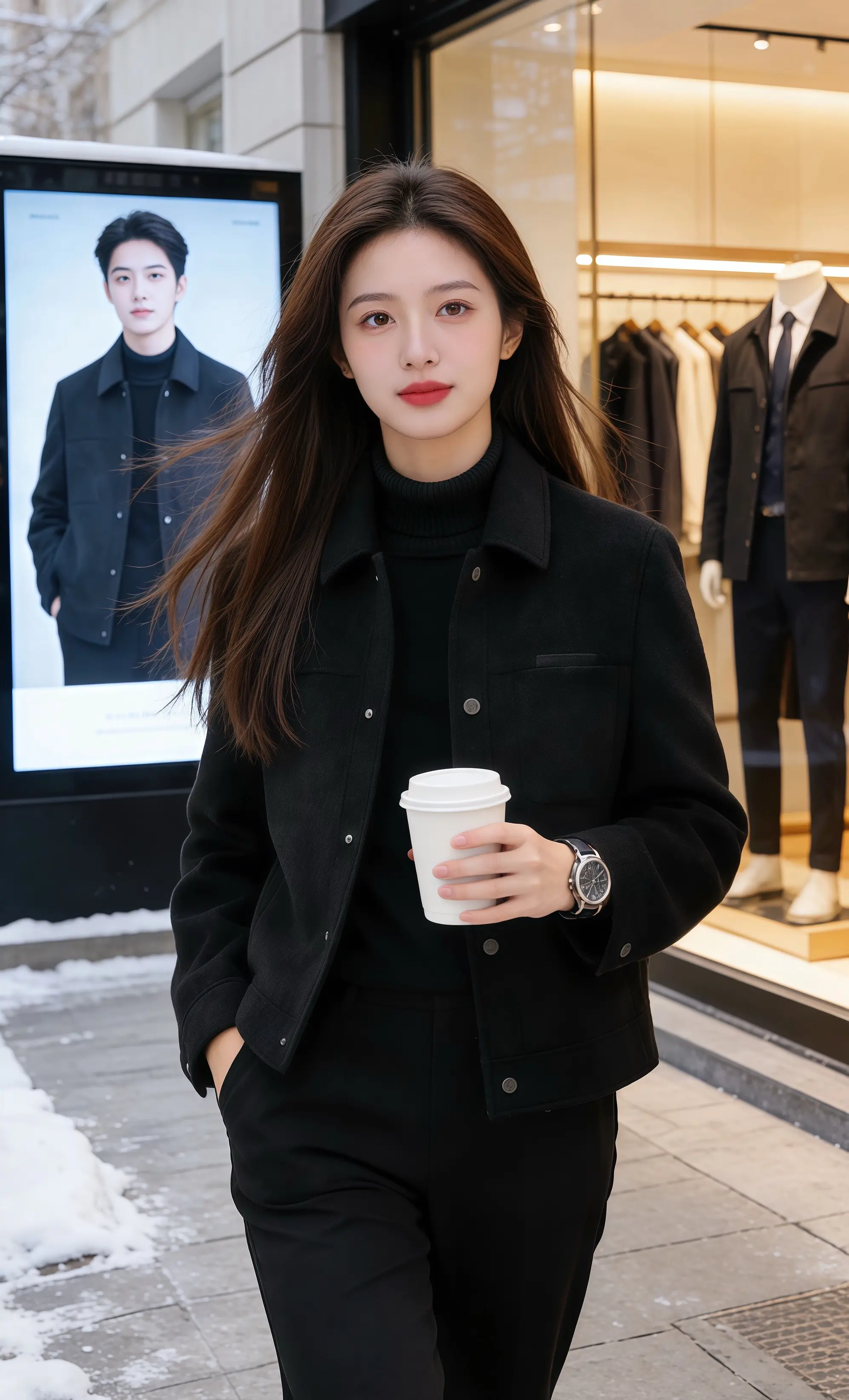 他攥着口袋里的摄影展门票,哪是夸穿搭,明明是她把黑色穿得揉进了心动,让飘雪的午后成了他独有的浪漫取景框。