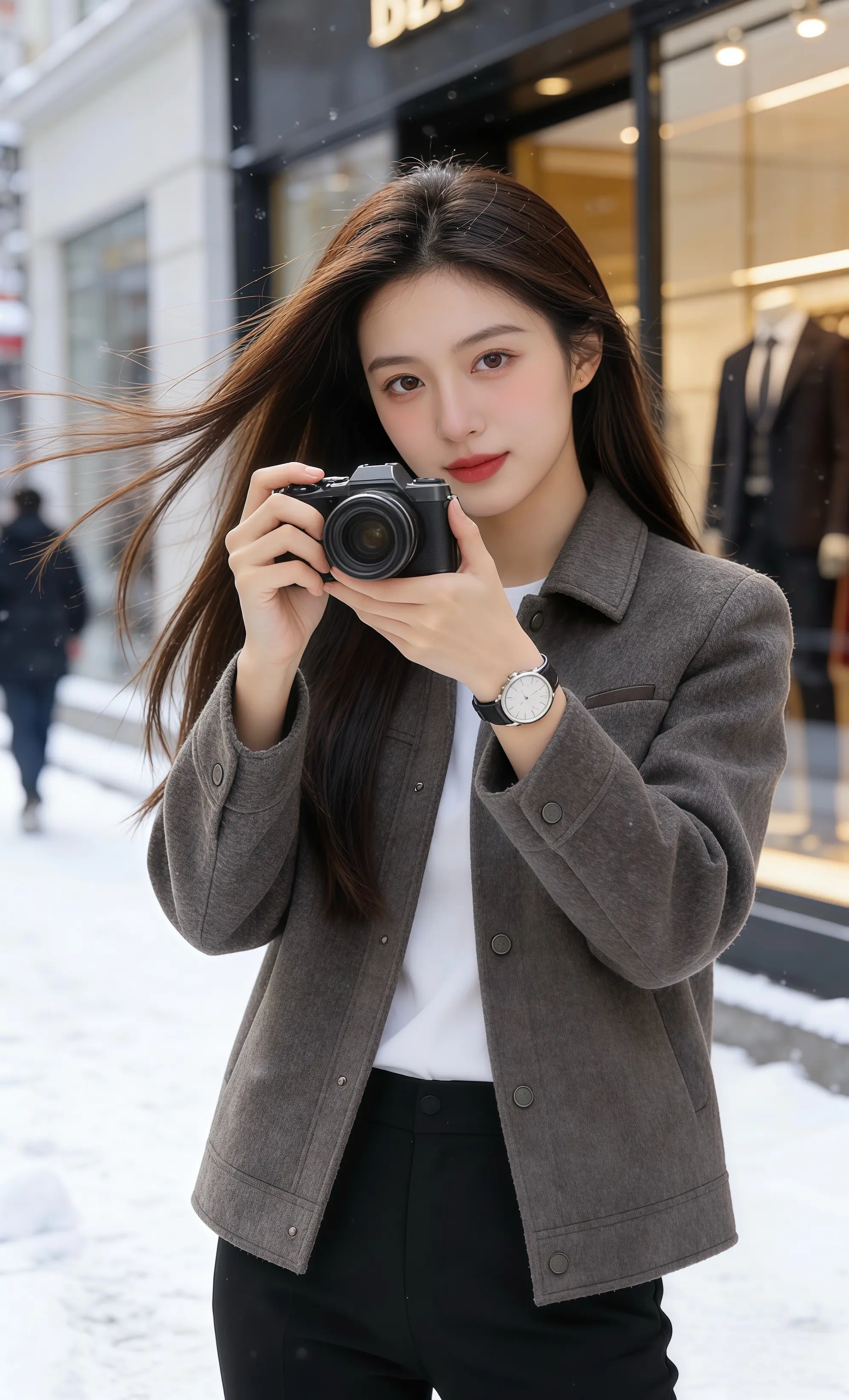 黑呢短外套与雪天镜头
