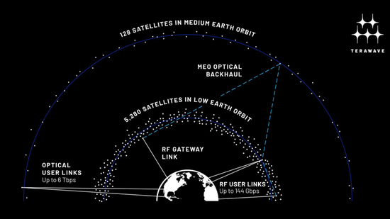 相比之下,TeraWave未来计划部署的5408颗卫星中,包括5280颗低地球轨道卫星和128颗中地球轨道卫星,采用双轨道设计,通过激光光学链路提供6Tbps的极速连接,Q/V波段也能提供144Gbps的传输速度。
