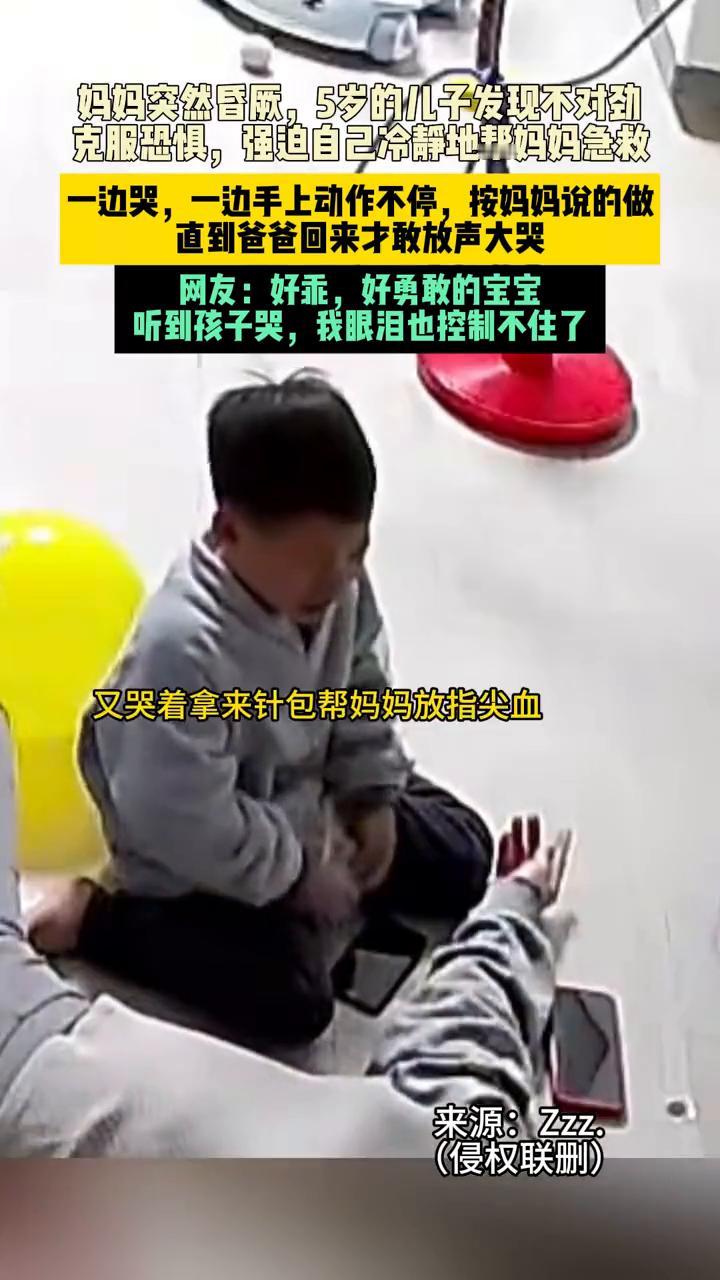 妈妈突然昏厥,5岁的儿子发现不对劲,克服恐惧,强迫自己冷静地帮妈妈急救。一边哭,一边手上动作不停,按妈妈说的做,直到爸爸回来才敢放声大哭。网友:好乖,好勇敢的宝宝。听到孩子哭,我眼泪也控制不住了。 宝宝发现妈妈不对劲,无措地抱着妈妈。听妈妈指挥,立刻坐起来帮妈妈按摩手指。想给妈妈按人中,但是不太会。妈妈拉着他的手教他,太害怕了,一边哭一边帮妈妈掐人中。又哭着拿来针包帮妈妈放指尖血。这孩子不仅懂事还很勇敢,遇到事情短暂慌张但不失理智判断将来必成。还不忘用纸巾擦,用碘酒消毒。 真的很乖,能精准的找到医疗箱,拿刺血针,刺血止血,最后居然还能记得包住针头扔到垃圾桶,还记得碘伏消毒,而且才五六岁。要不要克服一下怕针以后去当个医生,真的太细。直到看到爸爸回来才放声大哭,手还不忘帮妈妈掐着人中。爸爸回来了,孩子大声哭的时候我也看。