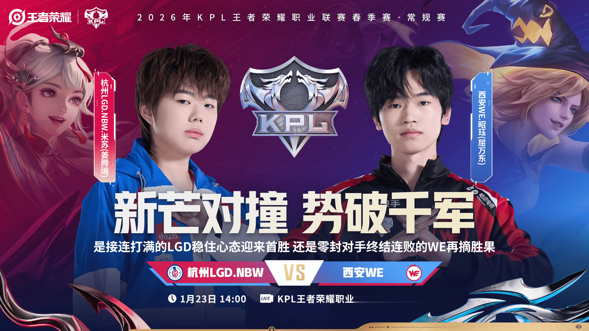 LGDNBW-九尾(许鑫蓁)LGDNBW-冰尘(李小龙)再次并肩作战,他们能否帮助每场鏖战五局的杭州LGDNBW拿下大场首胜?还是上场刚零封对手的西安WE王者荣耀势如破竹,再下一城?