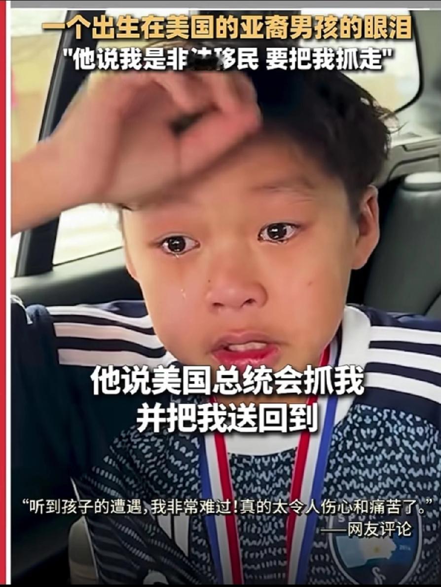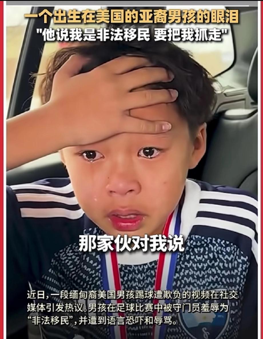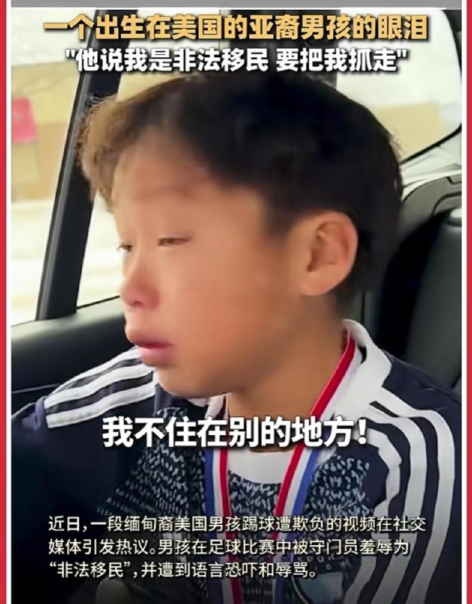 一名缅甸裔美国男孩和其他美国男孩一起踢球的时候被一名美国男孩指着鼻子威胁: “你是非法移民!美国总统会把你抓起来并把你送回到你原来居住的地方去!” 这话着实上头了缅甸裔小男孩的心,他哭着说: “我出生在美国啊!我真的不明白,为什么他们要对我说出这些话?这让我真的很难过,他们怎么能这样对我!” 都说美国是最讲人情的地方,这种话竟然会从一个美国孩子的口中轻易的说出来,可想而知,美国青少年的人文关怀教育出了大问题!
