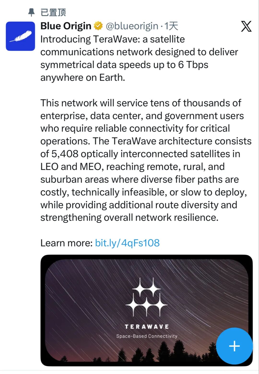 蓝色起源公司1月21日宣布推出TeraWave卫星通信网络。该网络旨在提供高达6Tbps的对称数据传输速度,覆盖全球任何地区。该网络将服务于数万家企业、数据中心和政府用户,这些用户需要可靠的连接来进行关键操作。
