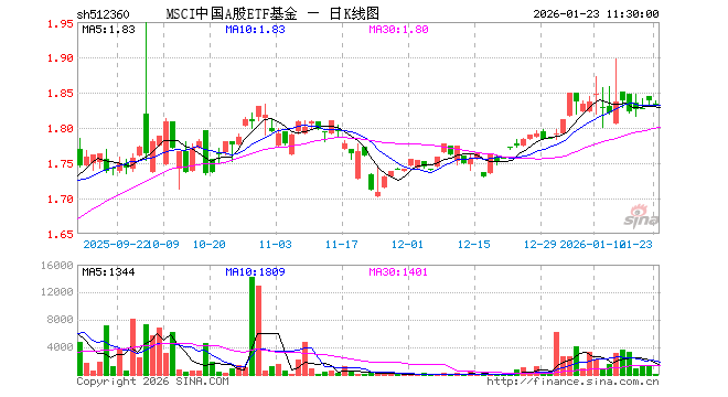 1月23日,截止午间收盘,MSCI中国A股ETF基金(512360)跌0.44%,报1.830元,成交额4768.00元。MSCI中国A股ETF基金(512360)重仓股方面,贵州茅台截止午盘涨0.14%,宁德时代跌0.36%,招商银行涨0.00%,工业富联跌4.06%,中国平安跌0.35%,紫金矿业涨1.01%,长江电力跌0.65%,中际旭创跌6.10%,农业银行跌0.29%,寒武纪跌1.77%。