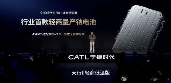 宁德时代发布新产品:行业首款量产钠电池来了日前,宁德时代正式发布天行II轻商系列动力电池,其中低温版为行业首款量产钠电池。这款45度钠离子电池能量密度175Wh/kg,循环寿命突破10000次,全球首款通过GB 38031-2025新国标认证,可适配中小VAN、小微卡等车型。耐低温能力表现优异,在-40℃极寒环境下仍保有90%可用电量,-30℃冻透状态下可即插即充,彻底解决北方地区商用车冬季使用痛点。值得一提的是,钠元素在地壳中丰度是锂的1000倍以上,提取成本仅为锂的1/20,长期来看将有效降低电池成本,提升轻商用车经济性。除了低温版,天行II轻商系列动力电池还包含超充版、长续航版、高温超充版三种。超充版:搭载高倍率充电技术,18分钟将电量从20%充至80%,主流100度电车型单次快充可增加约150公里续航,能为城配用户每日节省40-70分钟充电时间,大幅提升城配运输的运营效率。长续航版:创下轻商行业单包253kWh的最大电量纪录,同时实现800km的最长续航,核心适配城际干线的长途物流场景。搭配宁德时代泰山pack架构,在同等单包电量下可为整车减重约260kg,既提升了车辆的有效载荷,又进一步降低能耗。高温超充版:核心针对末端城配、自备车的运营场景,适配南方高温地区的补能与行驶需求,搭载定制化液冷热管理系统,在高温环境下仍能保持稳定的超充性能和电池寿命。同时兼顾了高可靠性与低运营成本,适配商超配送、社区末端配送等短距离、高频次的轻商场景。