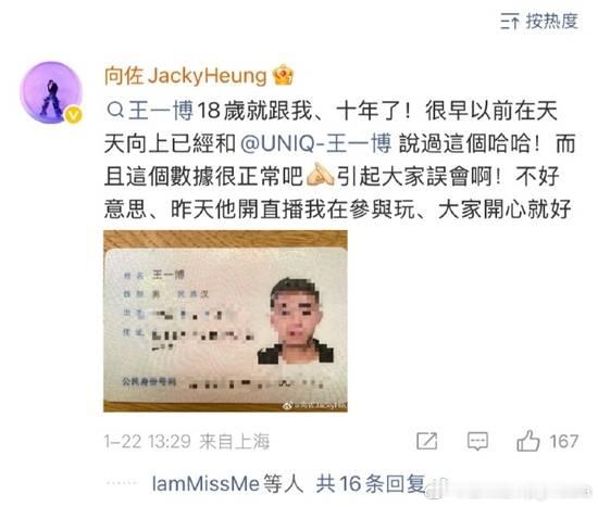 向佐用王一博同名账号开直播引争议 网友直呼被骗据中国蓝新闻报道,1月21日,向佐因使用一位名为“王一博”的工作人员账号直播引发热议。该账号仅2000粉丝,开播后直播间人数却瞬间冲上6万,不少网友误认是艺人王一博开播直呼被骗,向佐用王一博同名账号开直播话题也随之登上热搜。向佐在微博评论区晒出该工作人员身份证,显示其确名“王一博”,并称此人18岁起跟随自己工作十年,向佐还声称十年前录制《天天向上》时已向艺人王一博说明团队存在同名同事;强调直播是“参与玩”,对误会表示“不好意思”,并称“大家开心就好”,同时认为“6万观看数据很正常”。但公众质疑其利用顶流姓名引流,指出“告知姓名存在”不等于“允许商业使用”,向佐将二者混为一谈涉嫌偷换概念。向佐公开工作人员身份证照片(含姓名、身份证号、住址等完整信息),被指涉嫌违反《个人信息保护法》,侵犯公民隐私权。
