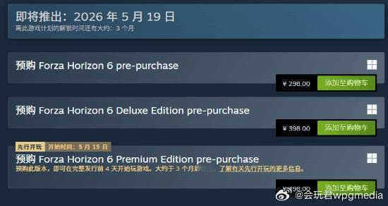 《极限竞速地平线6》国区售价298元《极限竞速:地平线6》售价正式公布,标准版Steam国区定价298元,豪华版398元,高级版498元(可提前4天解锁游戏)。游戏现已开启预购,定档5月19日发售。驾驶超过 550 辆真实存在的车辆,探索日本的绝美风光,在地平线嘉年华成为竞速传奇。以游客身份在日本开启你的旅程,探索充满劲歌金曲与日本文化的游戏世界。建造山谷地产、购买梦幻住宅,在全面定制的车库中展示你最珍贵的车辆收藏!与好友一起上街巡游,加入日本各地的车友会,充分发挥想象游玩 EventLab,加入地平线 CoLab 与其他玩家一起建造!欢迎来到东京!在这里,乡村与城市景观有机融合,伴你在地平线有史以来密度最高的地图中探索隐藏秘密,体验精密的纵向设计,游览设计丰富的生态环境,享受绝佳驾驶体验。漫游东京,在郊区和极具标志性的市区街道尽情兜风,在码头与工业区挑战自己的驾驶技术,饱览《Forza Horizon》系列史上最大的城市区域风光,尽情畅游这座车迷家园。