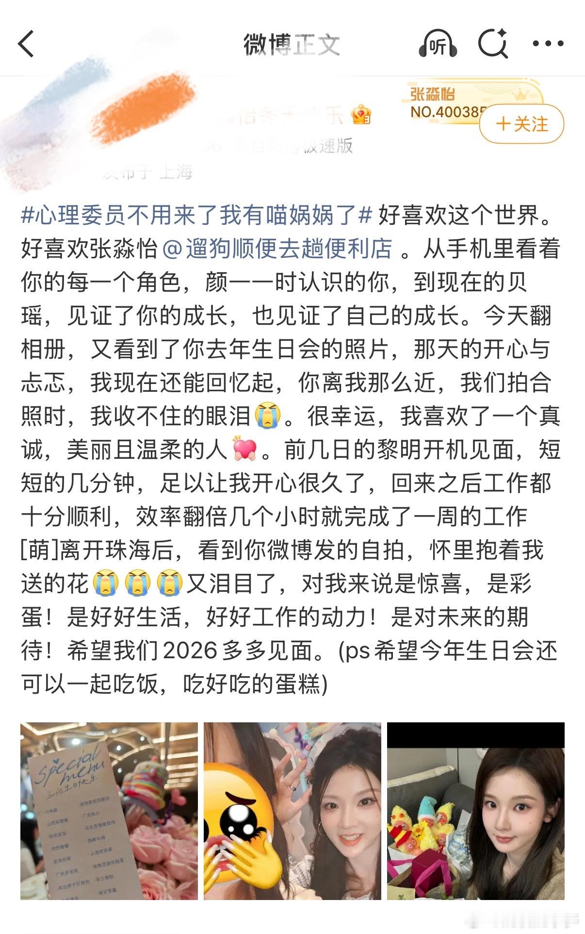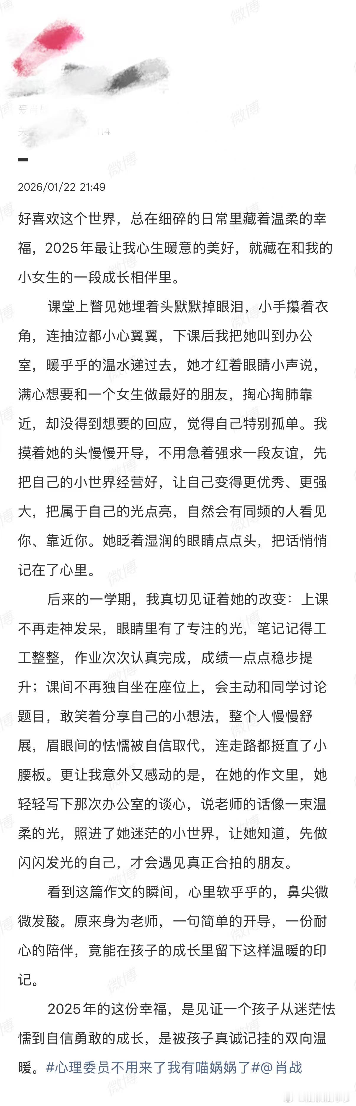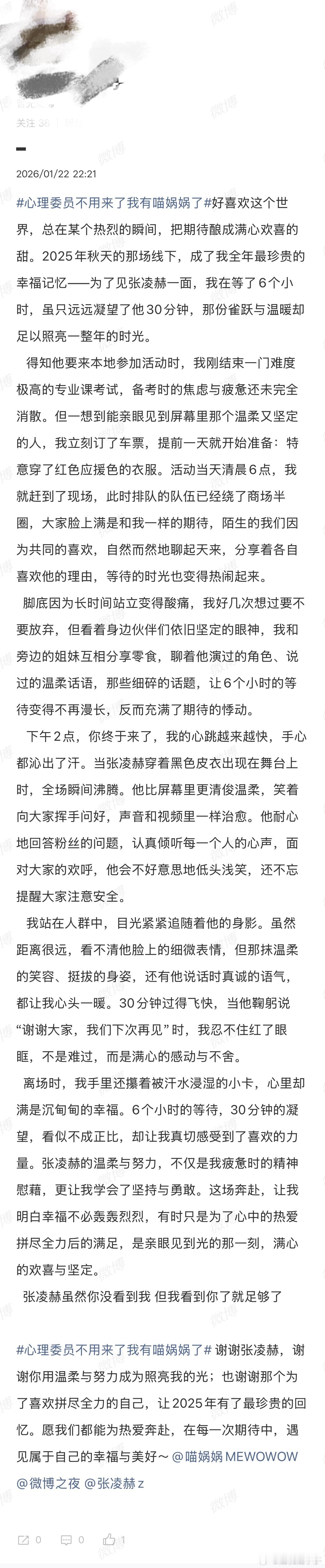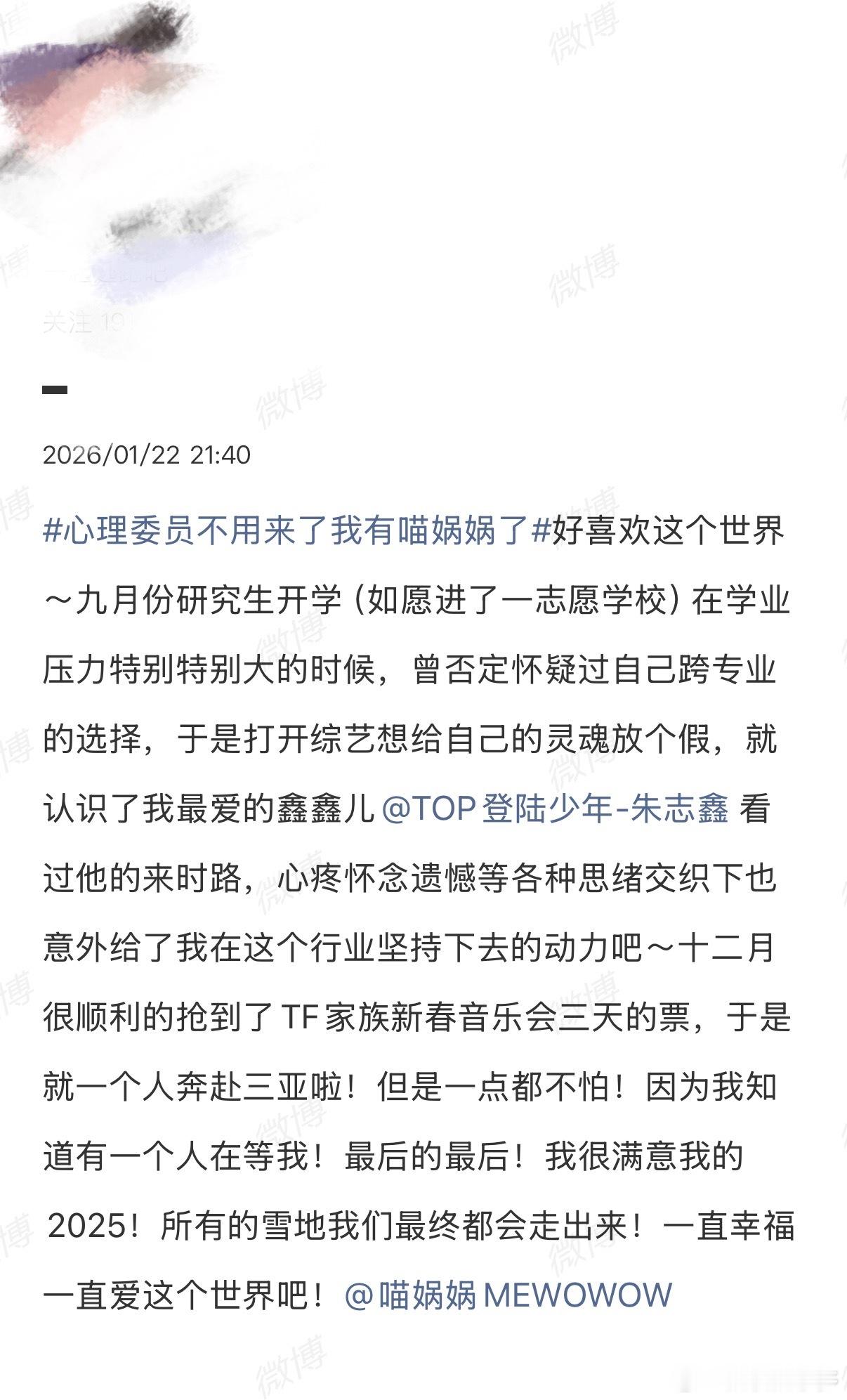 追星女最懂老派浪漫了你们看心理委员不用来了我有喵娲娲了 这个话题词了吗?就是昨天 送微博之夜门票发起活动,用“好喜欢这个世界”开头去分享生活,结果落地页全都是小女孩分享的长文故事。她们有人分享自己作为教师和学生相互治愈温暖的过程,有刚上研一不知所措的心路历程,也有为了见面奔赴三万公里的勇敢小女孩。有时候感慨追星的人心里都有一个“乌托邦”,难过的时候会偷偷躲进去、幸福的时候又会把这一切分享出来。生活里有很多不如意,但他们还是会选择用“好喜欢这个世界”来开头就写长文发表对自担的感谢,每每有这种时刻出现,就觉得心软软的。