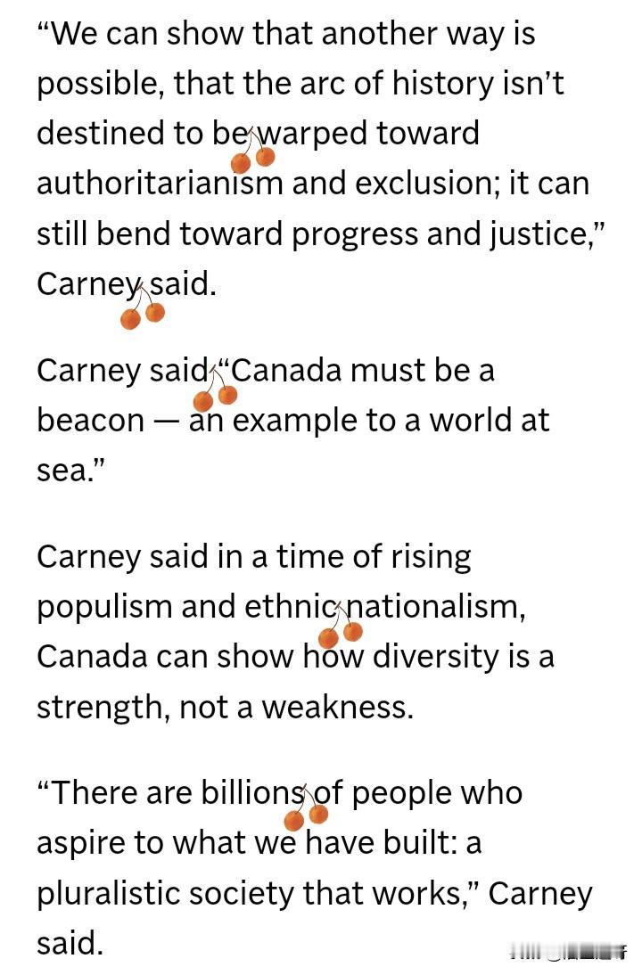 川普在达沃斯会谈上抱怨加拿大总理卡尼不懂感恩,还说加拿大是靠着美国才得以活着。 然后,卡尼回到加拿大,在魁北克市自由党内阁会议上再次回击了川普的攻击: “加拿大和美国建立了非凡的伙伴关系。无论是在经济、安全还是文化交流上。可加拿大并不是靠美国活着,加拿大的繁荣是因为我们是加拿大人”。 “我们可以证明,历史的走向并非注定要被迫扭向威权与排斥,依然可以曲折的走向进步与正义”。 “加拿大必须成为灯塔——在动荡的世界中成为榜样”。 “在民主倒退的时期,我们可以展示如何捍卫权利,如何让平等自由得以延续”。 “在高墙竖起,边界加厚的时代,我们可以证明:一个国家如何既开放又安全,既包容又强大,既有原则又有实力”。 加拿大