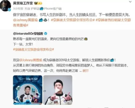 哇塞!黄景瑜要去太空啦爆个大猛料!黄景瑜锁定2028年太空之旅,将搭乘国产