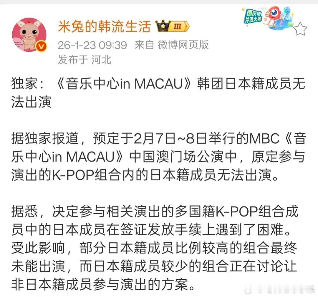 音乐中心澳门韩团日本籍成员无法出演MBC