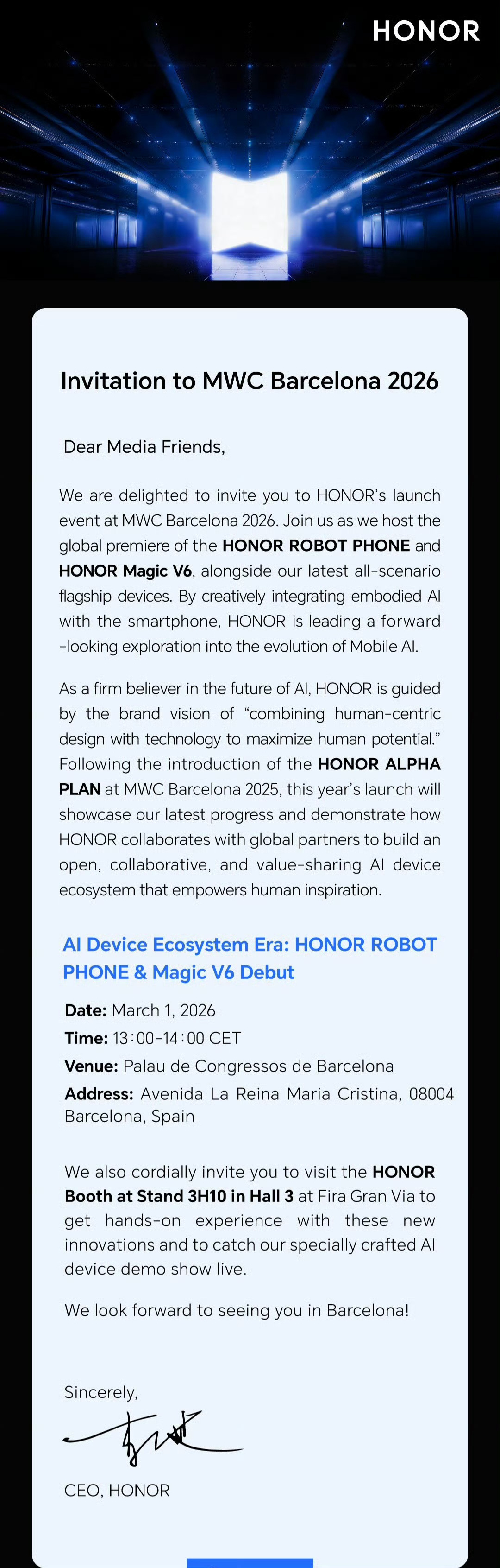 开年重磅!荣耀官宣将在 MWC 2026(3月1日,巴塞罗那)全球首发两款颠覆性新品:荣耀Magic V6,全球首款骁龙8EliteGen5大折叠,7k±大电池,2亿主摄,今年最薄最大电池的折叠旗舰。荣耀 ROBOT PHONE,全球首款机器人手机,隐藏式机械臂云台:全自动构图+目标智能跟随+极致物理防抖+端侧大模型 YOYO+情感感知+主动智能服务。Ai Agent+Skills,可调度全场景生态设备的Ai管家。人工智能->人文智能。3月1日,见证未来。新品驾到荣耀Magic V6智慧皮卡丘