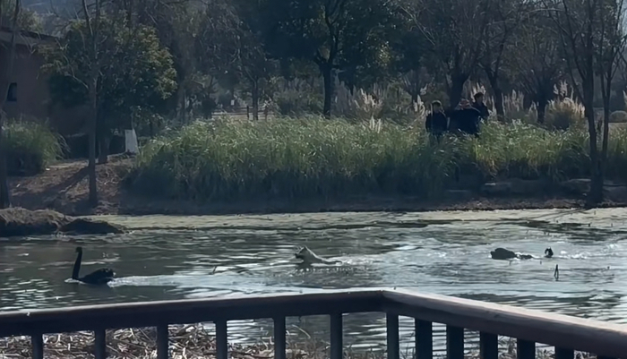 根据该网友发布的视频,新黄河记者看到,视频中两只较大体型的狗在湖中追赶黑天鹅,随即一起撕咬。过了一会儿,毛色较深的狗疑似听到指令后上岸;另外一只毛色较浅的狗在离开被撕咬的黑天鹅后,又去追水中的另一只黑天鹅。