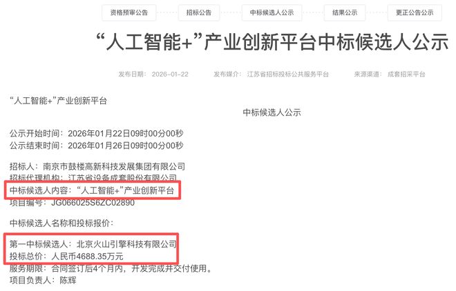 智东西1月23日报道,1月22日,江苏省南京市鼓楼高新科技发展集团有限公司《“人工智能+”产业创新平台》项目发布中标候选人公示,火山引擎为第一中标候选人,中标金额为4688.35万元。