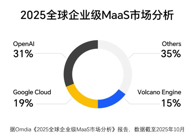 2025年12月17日,国际市场调研机构Omdia发布的《2025全球企业级MaaS市场分析》报告显示,火山引擎日均Tokens调用量超30万亿,市场份额为15%,排名全球第三、中国第一,仅次于OpenAI和谷歌云。