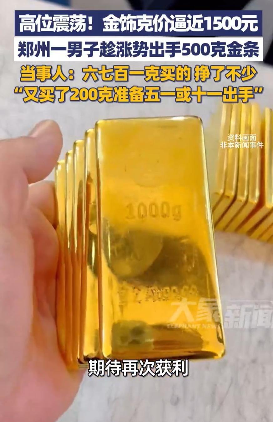 这就是命啊!河南郑州,荆先生见金饰克 价快到1500元,果断动手卖金条。 卖了500克刚落袋,转手又买200克,操作看得人直愣神。 2026年1月,荆先生盯着金价到1500元,想起当初600多一克买的500克,干脆先卖了。 这一 卖赚40来万,他说要落袋为安,可转头又买200克,打算五一或国庆消费旺季再卖。 有人说他贪心,其实他是算过账——全球通胀还在,地缘因素没消,金价说不定还能涨。 之前金价涨得快,不少人赚点就跑,他倒好,把大部分确定性换成现金,留小部分赌可能性,既稳妥又聪明。 新购的200克金条,他直接放柜子没上锁,转身续茶望窗外哼小曲,那股从容劲儿,像早摸透了市场脾气。 荆先生这操作,其实是普通人的投资智慧——不把鸡蛋放一个篮子,也不把蛋糕全吃完。 他怕高位回调把利润吐回去,所以先卖500克;又信长期趋势,所以留200克等旺季,把贪心和理性揉成了稳招。 打工人哭晕:当初600多我也想抛啊,结果小赚几百就跑了,现在肠子悔青! 不少网友跟着吐槽,当初自己也有机会,就是没扛住小利诱惑。 荆先生的操作,是把“落袋为安”和“留有余地”焊死了,既赚了大头,又没错过后续机会,换作你,会不会留这200克? 我觉得荆先生这招真的适合普通人,不像那些梭哈的,他是稳扎稳打,把利润握在手里再赌点小的。投资不就求个踏实嘛,别太贪也别太怕,学他这样平衡着来,日子才稳当。 这事你怎么看?