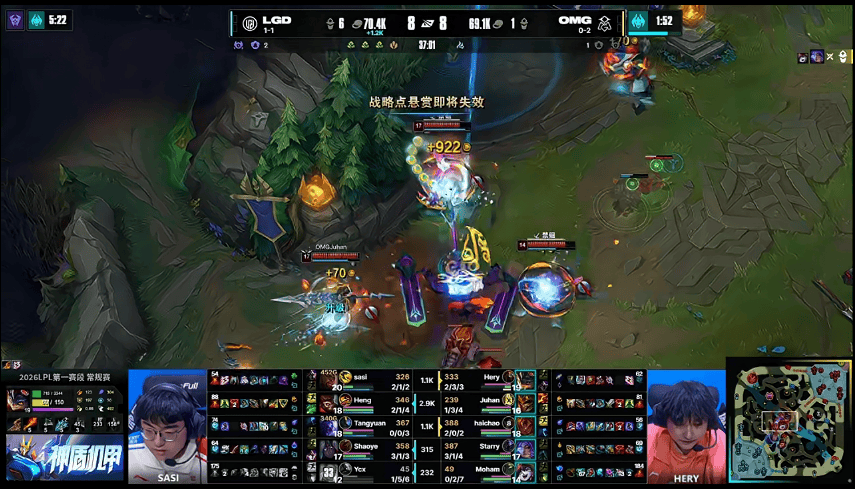 12分钟,LGD野区找到OMG的疏忽直接开团,打出0换2