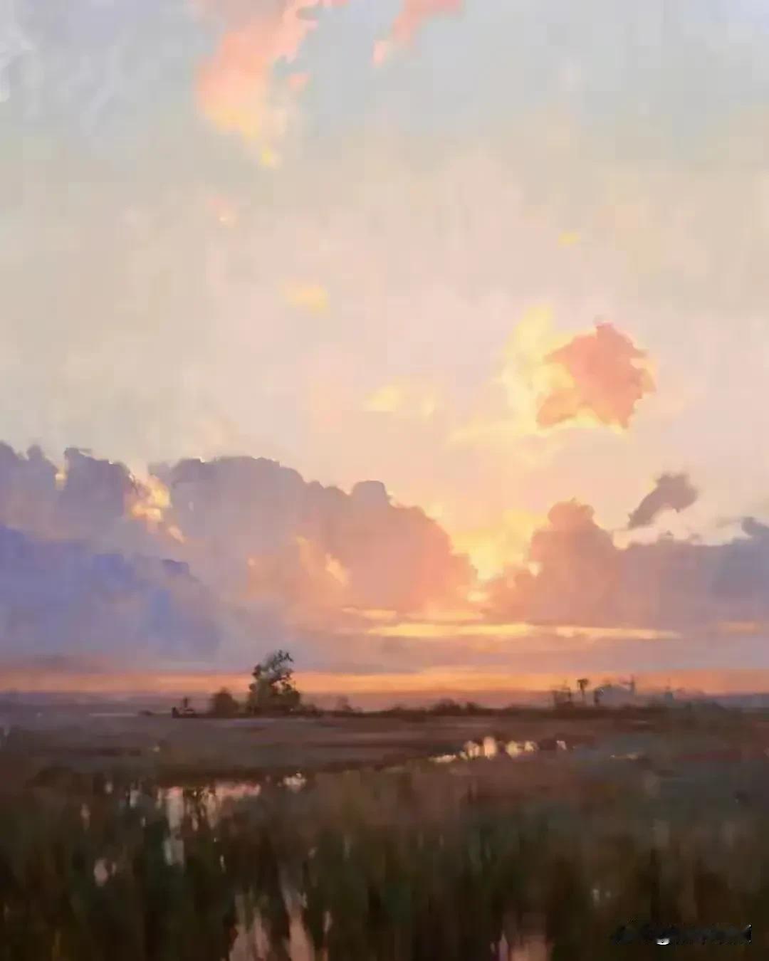 冬日湖畔的宁静与美丽,白雪覆盖的树木倒映在湖面上,四季黄昏仿佛置身于童话世界。∽油画风景