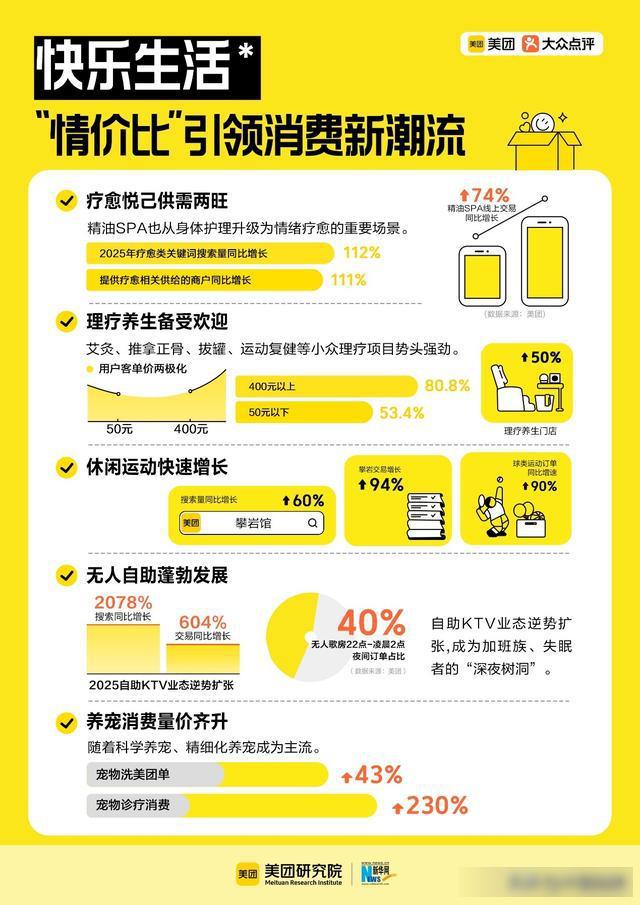 疗愈类服务消费供需两旺。报告显示,2025年美团疗愈类关键词搜索量同比增长112%,提供疗愈相关供给的商户同比增长111%,不少年轻人把疗愈消费当作“情绪创可贴”。