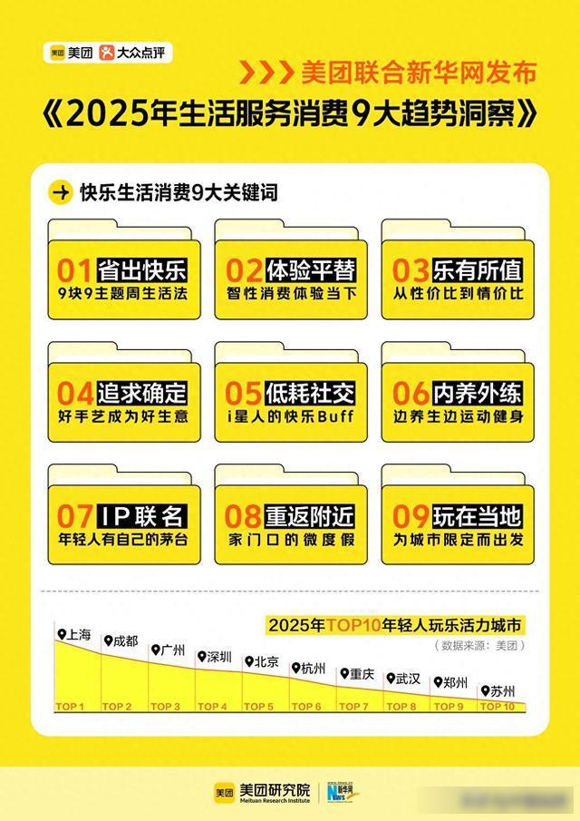1月21日,新华网联合美团研究院发布《2025生活服务消费趋势洞察》(以下简称报告)。2025年,美团App上与快乐生活相关的服务消费订单量同比增长36%,95后消费者占比近60%,上海、成都、广州、深圳、北京、杭州、重庆、武汉、郑州、苏州位列TOP10年轻人玩乐活力之城。据报告,2025生活服务消费九大关键词为:省出快乐、体验平替、乐有所值、追求确定、低耗社交、内养外练、IP联名、重返附近、玩在当地,提供新奇感、释放压力、彰显态度的“情价比”消费悄然崛起。