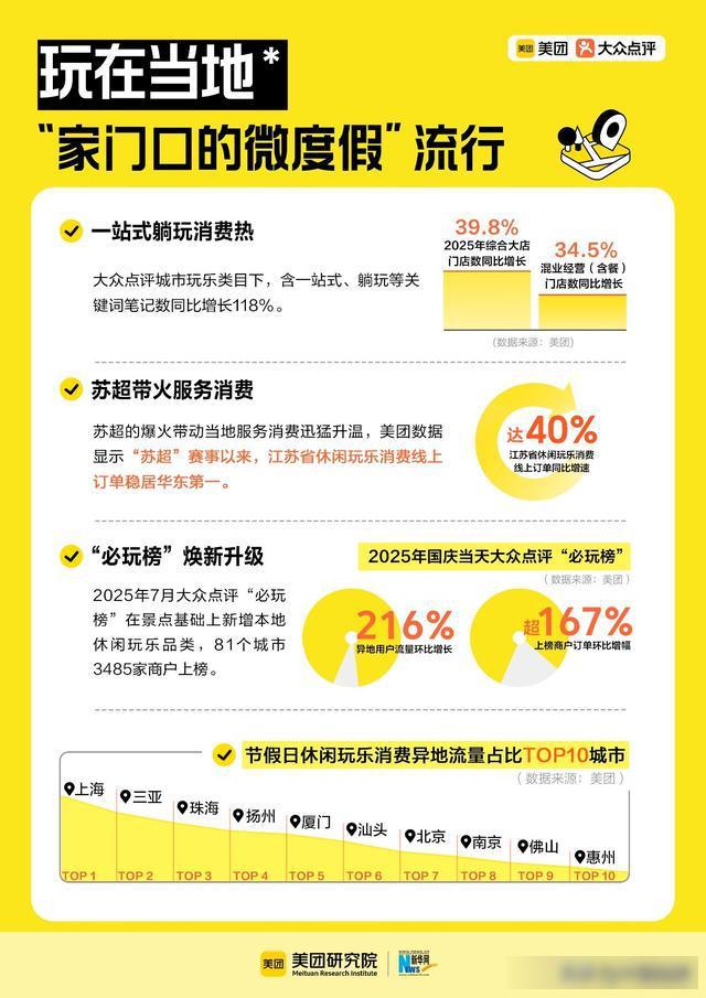 2025年冬季,“南泥北运”如期上演,东北洗浴中心挤满了体验搓澡的南方游客,甚至包括不少外国人。以美团2026洗浴指南三钻商户“沐里沐外”为例,异地消费用户占比超40%。2025年,苏超的爆火带动当地服务消费迅猛升温,美团数据显示“苏超”赛事以来,江苏省休闲玩乐消费线上订单稳居华东第一,同比增速达到40%左右。