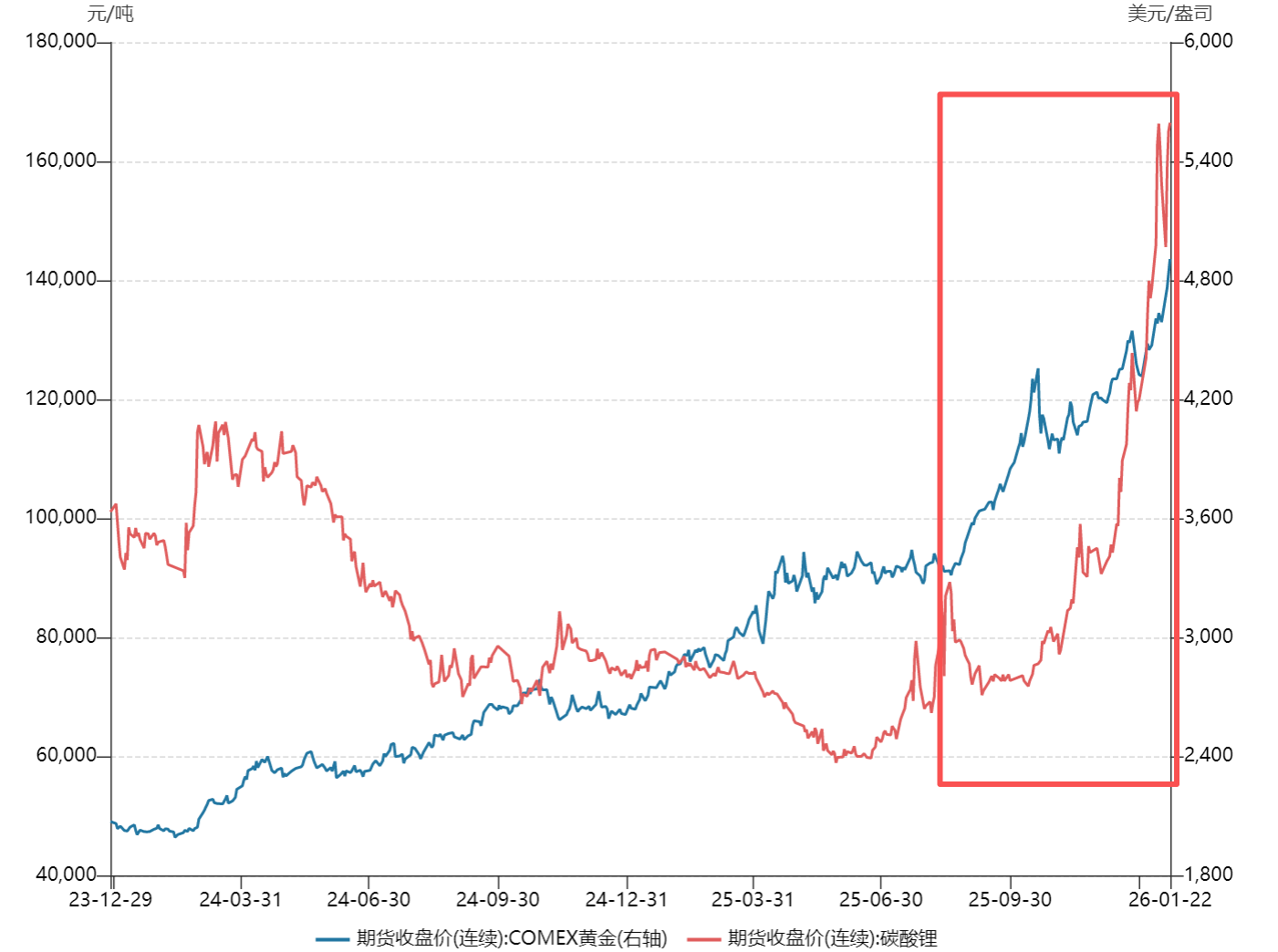 新时空统计:截至1月21日,现货黄金已站上4800美元/盎司,距4900仅一步之遥;现货白银同步突破90美元关口。国内方面,碳酸锂期货主力合约一度升破17万元/吨,最新价仍高达16.67万元;沪铝、沪铜此前亦刷新多年高点,近期虽小幅回落,但强势格局未改。