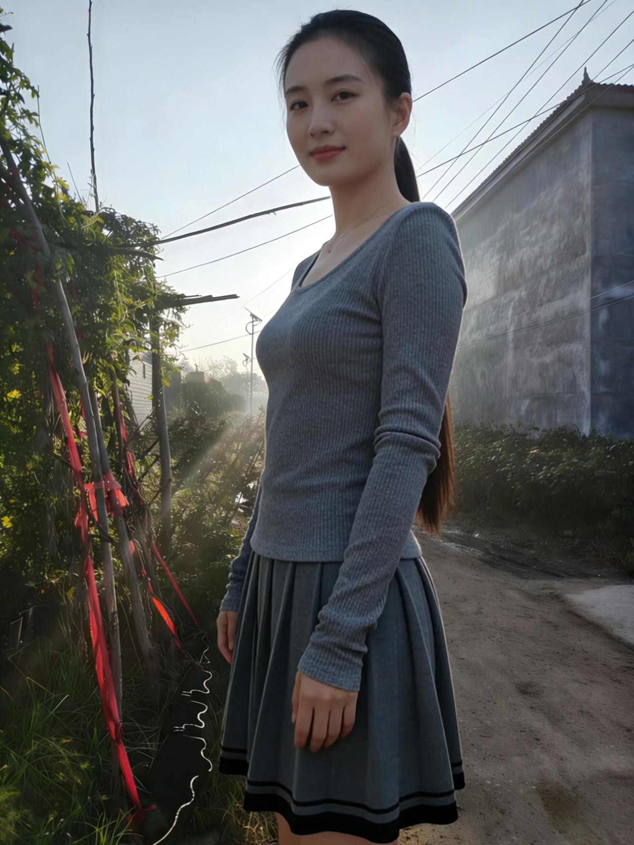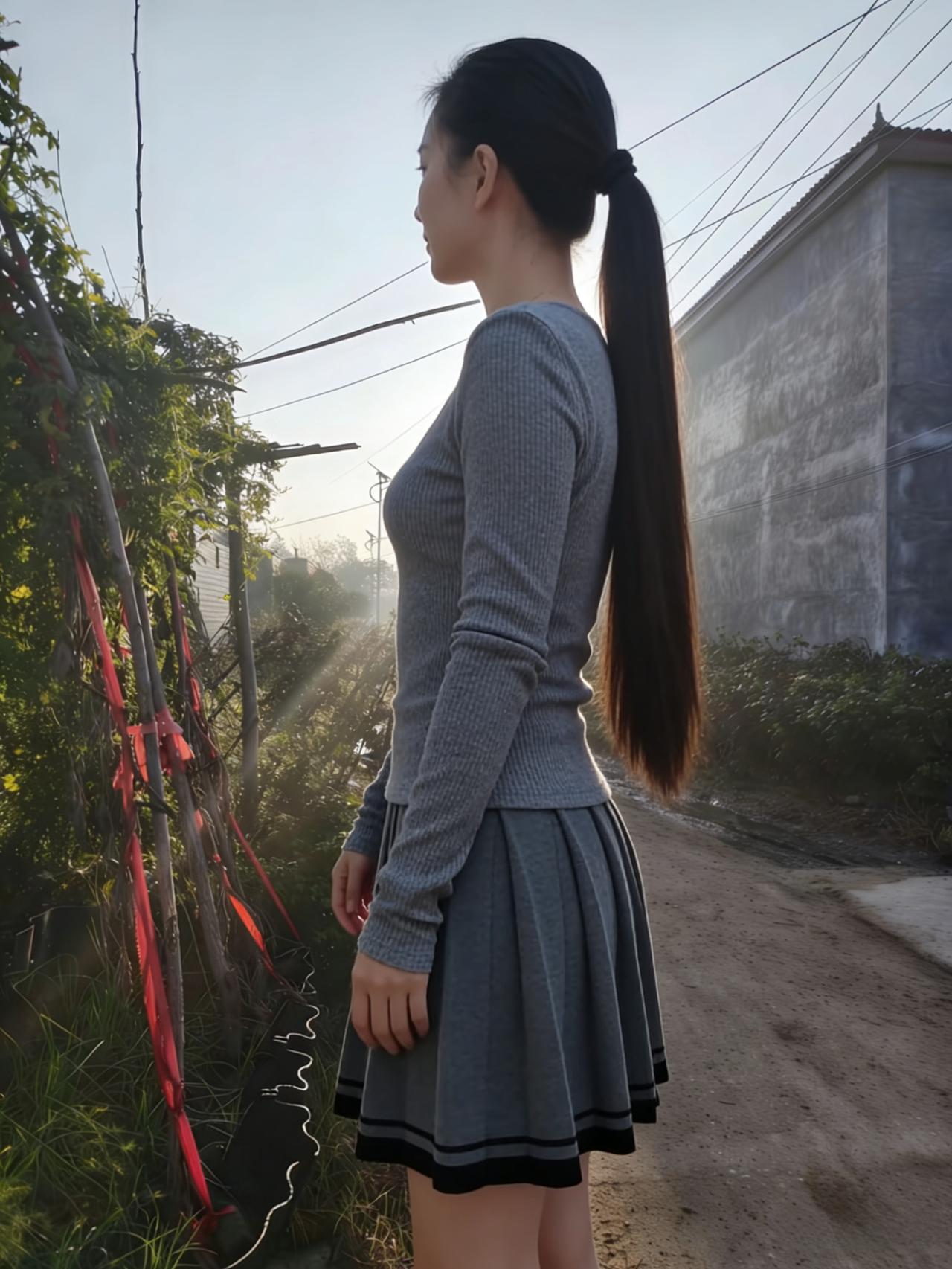 夕光斜照百褶裙,风动红丝蔓草薰。 凝望归鸿飞尽处,一痕秋影入云深。