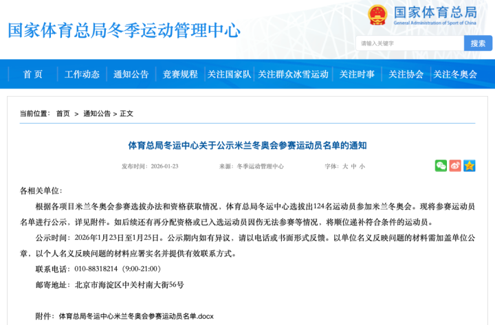 北京时间1月23日上午,国家体育总局冬季运动管理中心在官网公示了参加2026米兰-科尔蒂纳冬奥会的运动员名单,中国代表团共派出124名运动员参赛,创下中国参加境外冬奥会的参赛人数新高。