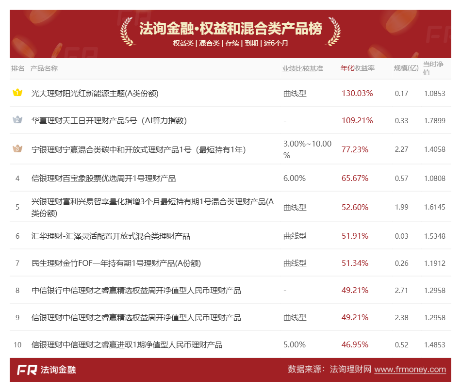 2.榜单所展示产品为理财公司发行的存续权益和混合类理财产品;