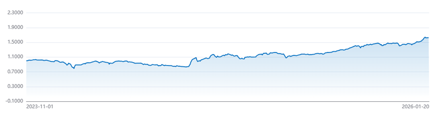 从收益上看,该产品成立以来,业绩表现较好。据披露,截至1月21日,该产品净值近1月上涨11.608%、近3月上涨12.958%、近半年上涨27.482%、近1年上涨47.173%、近2年上涨75.139%,成立以来上涨62.874%。该产品成立以来累计净值如下: