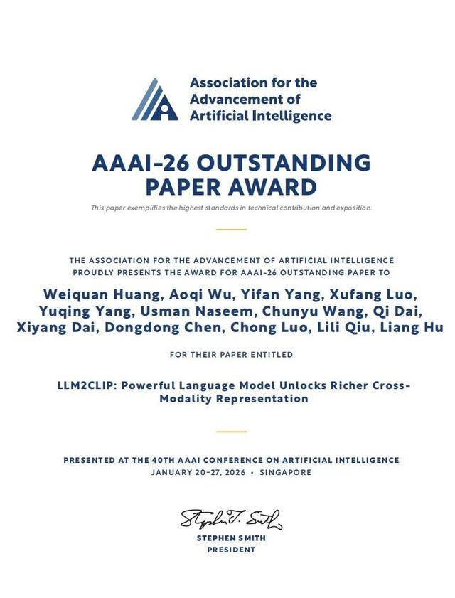 该获奖论文题为“LLM2CLIP:PowerfulLanguageModelUnlocksRicherCross-ModalityRepresentation”。CLIP是当前人工智能领域具有重要影响力的多模态基础模型,其核心思想是通过大规模图像与文本数据的联合训练,使计算机能够在同一语义空间中理解图像和语言,从而支持图像识别、检索等多种任务。