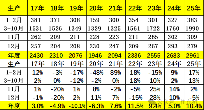 12月乘用车生产279万辆,同比下降5%,环比下降10%。1-12月乘用车生产2961万辆,累计同比增长10%,12月乘用车生产较2024年12月的293万辆减少14万辆,减产力度较大。