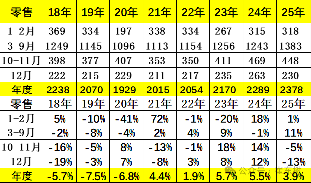 12月全国乘用车市场零售230万辆,同比下降13%,环比增长3%。今年以来累计零售2378万辆,同比增长4%。今年国内车市零售累计增速从1-2月增长1.2%,3-6月增长15%,7-9月增速徘徊在6%左右,10-12月回落到偏低状态,呈现4季度高基数的减速特征,基本符合年初判断的“前低中高后平”的走势。