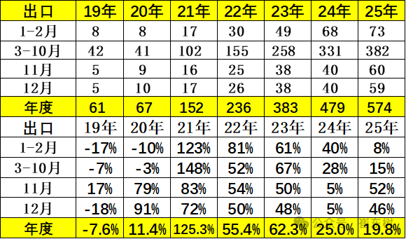 根据乘联数据,12月乘用车出口(含整车与CKD)59万辆,同比增46%,环比下降2%,1-12月乘用车厂商出口574万辆,同比增长20%。