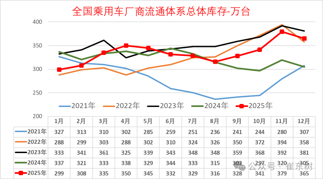 崔东树发文称,2025年12月月末全国乘用车行业库存365万辆,较上月下降14万辆,较2024年12月增60万辆,根据2025年12月底的库存与未来销量综合预估的现有库存支撑未来销售天数在66天,相对2024年12月的46天增加20天。