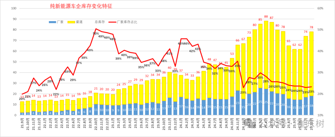 从仅生产新能源车企业的库存变化特征分析看,随着反内卷的推动,行业库存9月降到62万辆,12月行业库存上升到78万辆,较峰值库存降10万辆,但较11月增加4万辆。