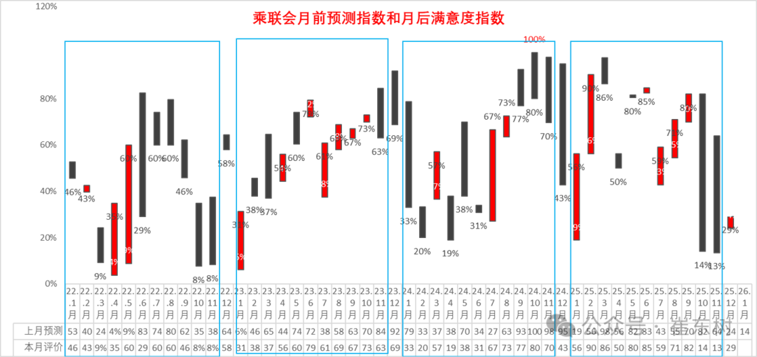按照PMI指数的设定方式和评价结果评价月度市场表现。根据厂家内部人员的预测汇总测算,乘联会预测团队2月以来对市场预测很乐观,逐步悲观,12月月前预测是乐观度24%,12月初的12月月后满意度为29%。团队对1月市场的乐观度达到14%,这是厂家比较差的预测,期待部分地方的补贴进一步加力。