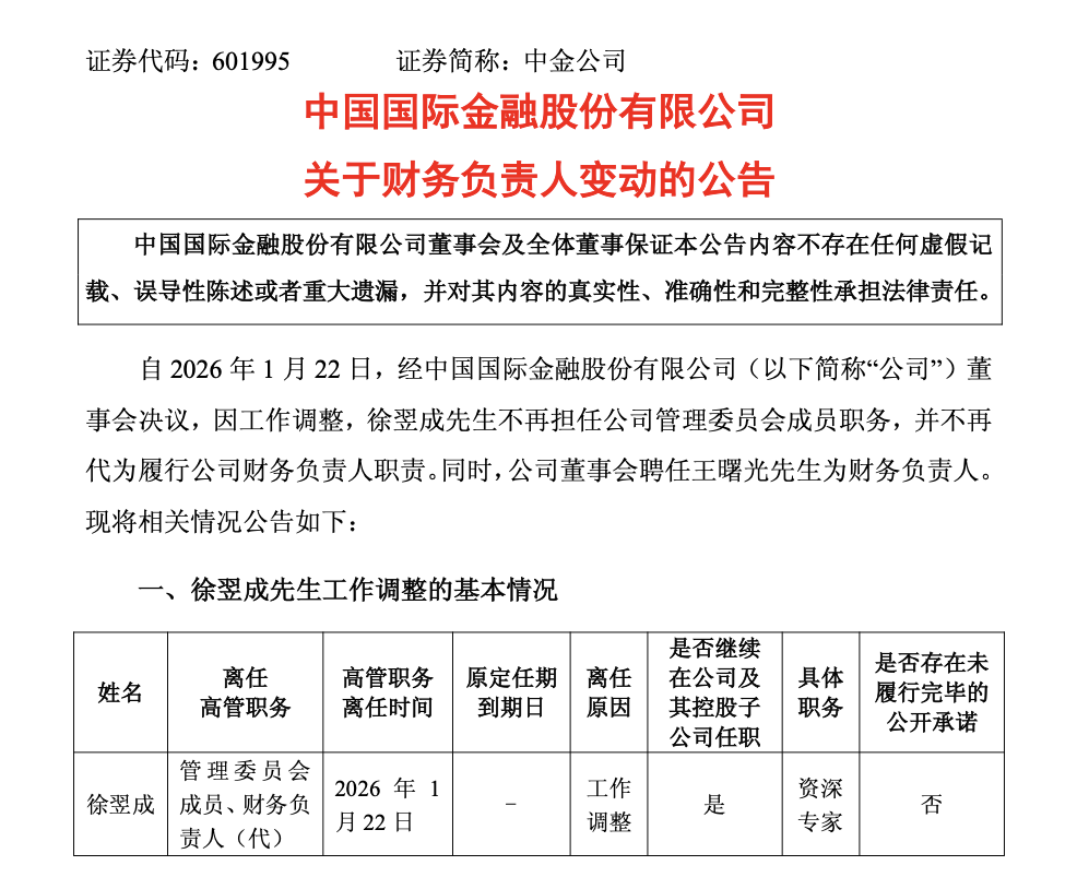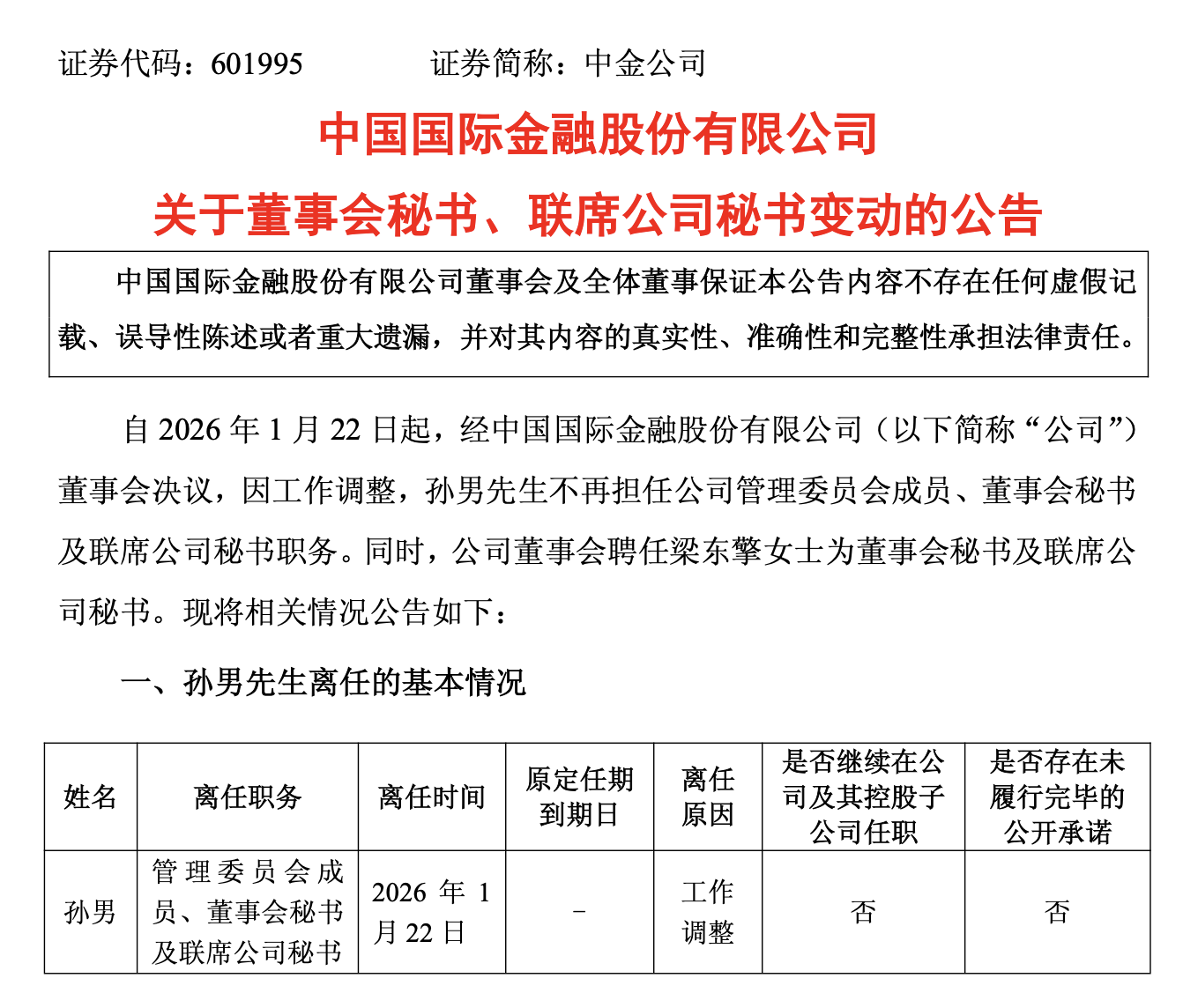 2026年1月22日晚间,中金公司(601995)连发两则公告,宣布了财务负责人与董事会秘书两大核心岗位的同步换任。现任总裁王曙光将兼任财务负责人,80后高管梁东擎则获聘为新任董秘及联席公司秘书。此次人事调整正值中金公司推进吸收合并东兴证券(601198)、信达证券(601059)的关键时刻。