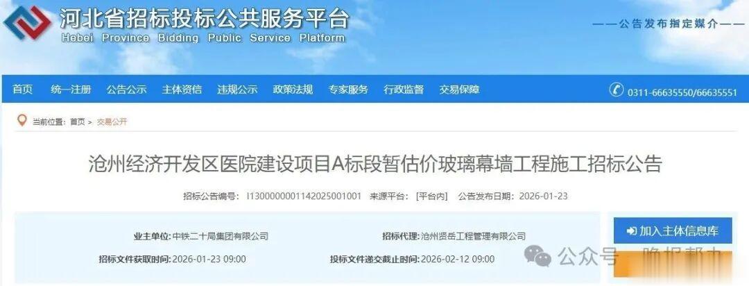 1月23日,河北省招标投标公共服务平台发布[沧州经济开发区医院建设项目A标段暂估价玻璃幕墙工程施工]招标公告。