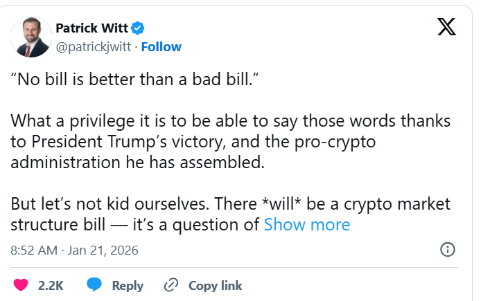 在Coinbase首席执行官BrianArmstrong帮助拖延了美国参议院关于加密货币的全面立法一周后,白宫加密顾问PatrickWitt通过X社交平台表达了他针对Armstrong的不同意见,Armstrong曾警告声称“没有法案比一个过于糟糕的法案更好”。Witt在推文中写道:“你可能不喜欢CLARITY法案《CLARITYAct》的每一部分,但我可以保证,你会更讨厌未来民主党版本的法案。”