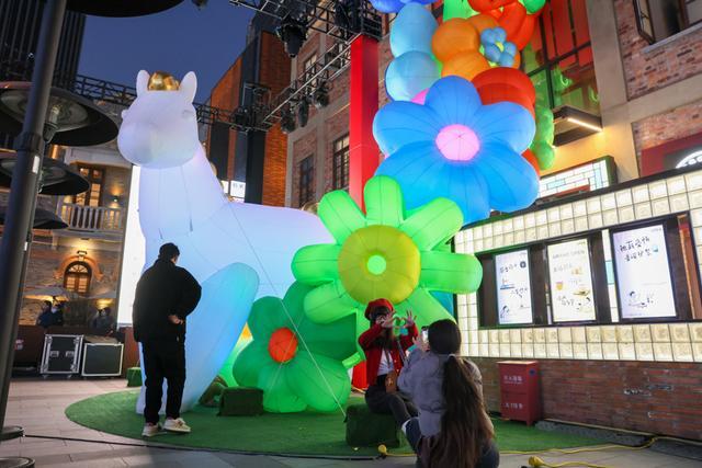 本届灯会装置也带着“小辰光味道”。灯会策展人杨威杰介绍,这些大型灯光艺术装置灵感取自儿童乐园里的旋转马车、童话中的飞马等,色彩鲜艳、造型萌趣,“富有视觉冲击的装置与百年弄堂并置,新旧融合别有韵味”。