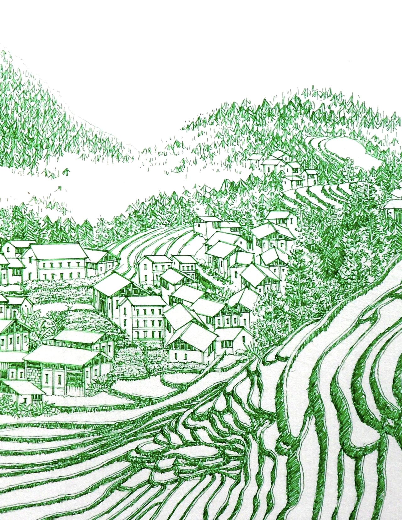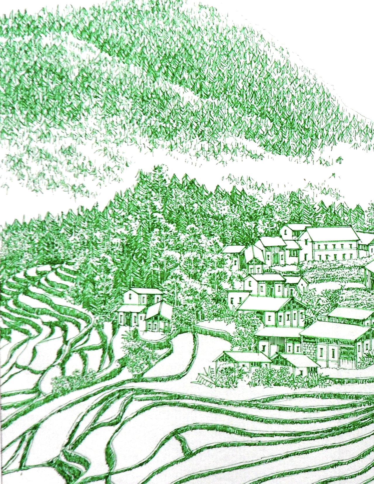 [途虫原创绘画]昨天用红色签字笔画了一幅梯田山水画,今天用绿色签字笔来尝试一下,