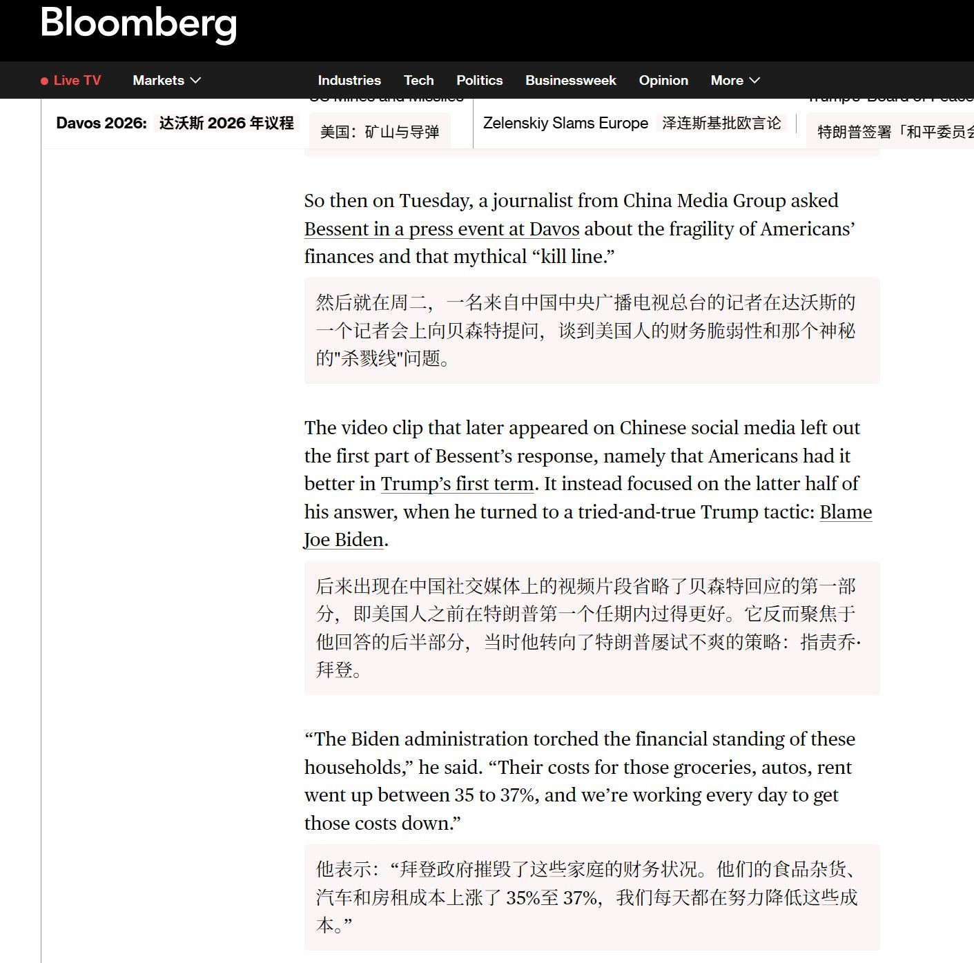 🔻彭博社关于贝森特在达沃斯的报道并没有提什么不存在的虚假概念“Q line”,